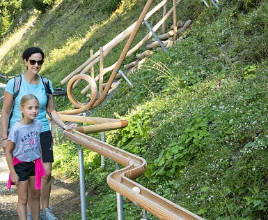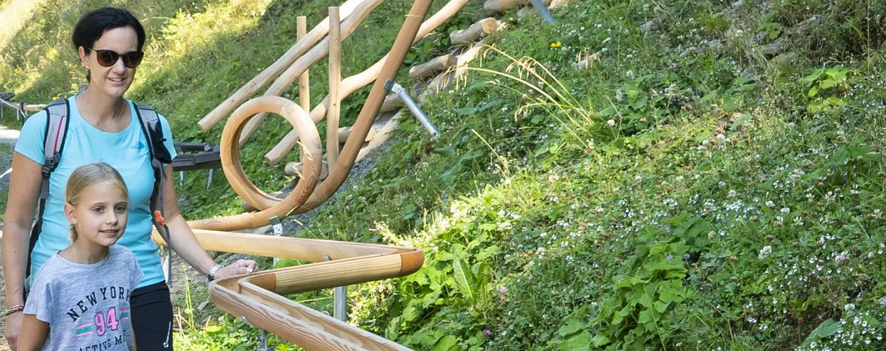Die Spoggolino-Kugelbahn auf der Choralpe auf 1.820 m sorgt bei Groß und Klein für Action und Spaß. Hol dir deine Holzkugel an der Bergstation oder Talstation der Alpenrosenbahn und starte dein Abenteuer. Die Kugel saust durch die Bahn, springt und rollt rasant durch Kurven und macht manchmal sogar Musik. Du kannst auf zwei Spuren spielen und testen, wer die Kugel am geschicktesten ins Ziel bringt. Du läufst nebenher und feuerst sie an. Wer ist schneller?